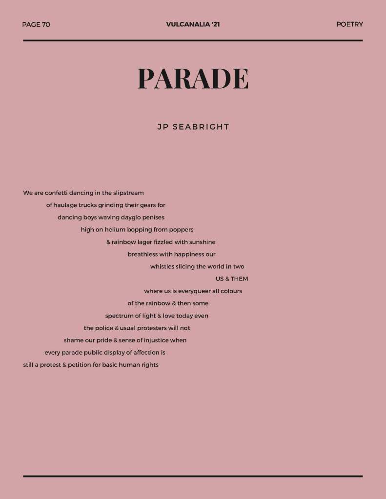 PARADE One of five poems published by Lupercalia Press in their Vulcanalia Anthology in August 2021. Share this: Click to share on X (Opens in new window) X Click to share on Facebook (Opens in new window) Facebook Like Loading... Published by JP Seabright wayward word wrangler View all posts by JP Seabright