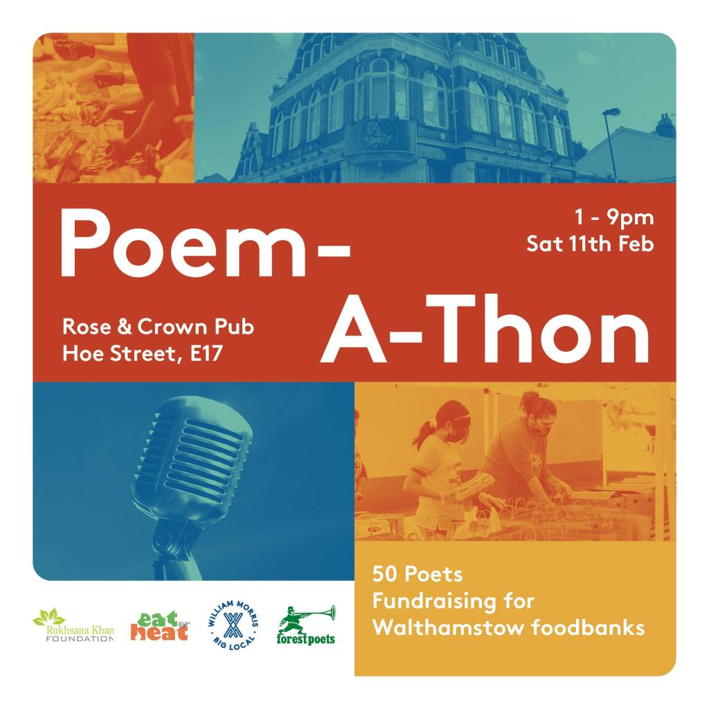 I am part of the Forest Poets Poem-A-Thon fundraising event on Saturday 11th February, raising money for the Walthamstow foodbanks Eat or Heat and the Rukhsana Khan Foundation. It promises to be a fantastic day with 50 poets signed up to read!