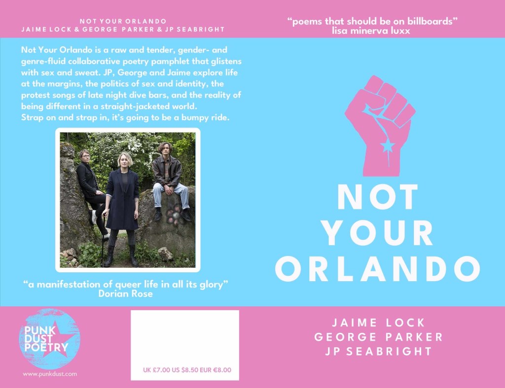 Not Your Orlando is so great! Celebrating queerdom, queerness, and being queer, it’s the latest publication from Punk Dust Poetry, run by the inimitable poet Jamie Woods. Composed by three poets, it wasn’t clear to me whether the poems were co-authored (each writer collaborating to create one poem), each by individual poets, or some mix of these. I suppose not knowing presents within the book a sense of there being a ‘united front’, and an overall voice which is all/none – fitting, since the book explores the experience of being gay in a culture which still harbours bigotry, as the title of the final poem – You Fucking Dyke! – makes plain.